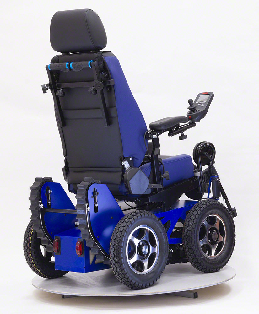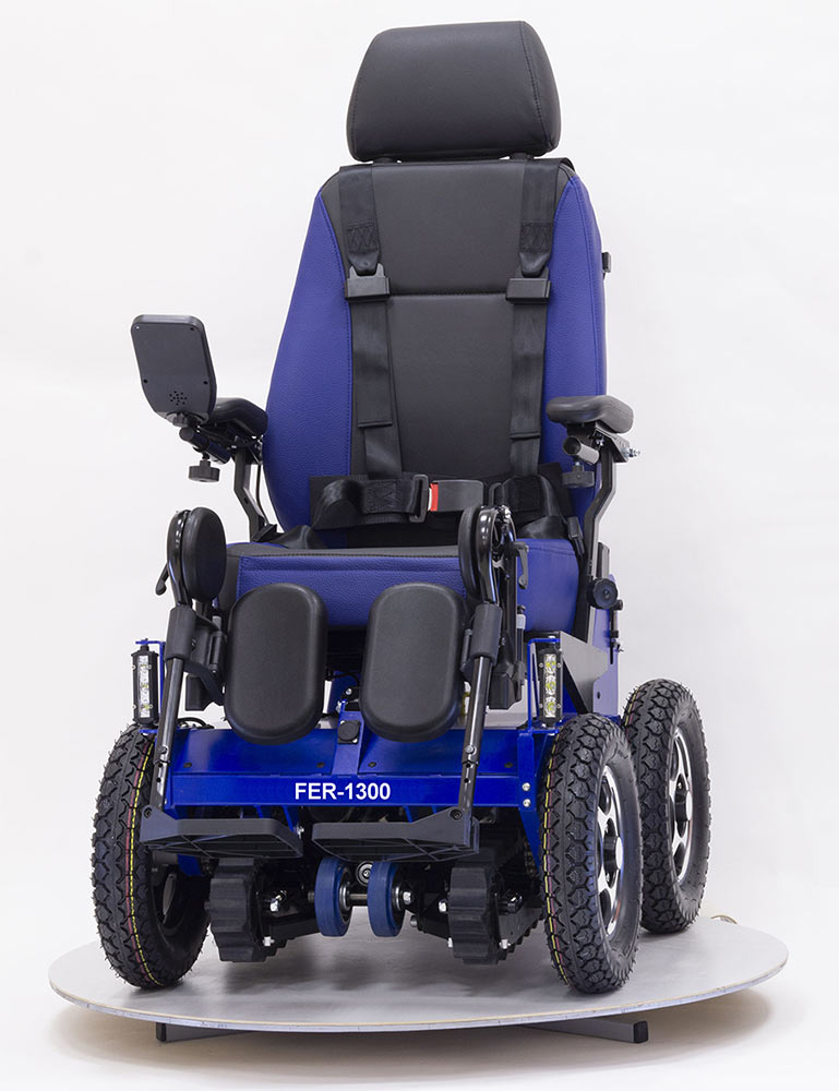 Der Elektrorollstuhl FER-1300 verfügt über vier Antriebsräder und einen Raupenantrieb mit vier Raupen in leichter W-Form zum Klettern. Die Vorteile dieses Modells lassen sich auch auf seine kompakten Abmessungen zurückführen. Das Fahrzeug ist 65cm breit und nur 86cm lang ohne Fussstützen und 105cm mit Fussstützen. Das Gewicht des Geländefahrzeugs beträgt dabei nur 98kg !
