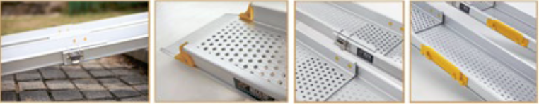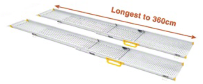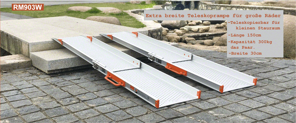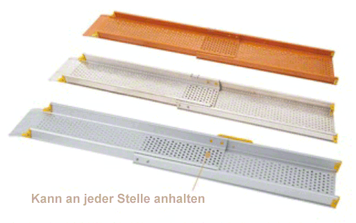 Diese Art von Rampe besteht aus mehreren ineinandergeschobenen Elementen, die ausgezogen werden können, um eine längere Rampe zu bilden. Teleskoprampen gibt es in verschiedenen Größen und Gewichtsklassen, um den Bedürfnissen unterschiedlicher Fahrzeugtypen und Lasten gerecht zu werden.Teleskoprampen sind in der Regel aus Aluminium gefertigt, um eine hohe Tragfähigkeit und Haltbarkeit zu gewährleisten. Sie sind auch in verschiedenen Designs erhältlich, wie zum Beispiel als faltbare oder zusammenklappbare Rampen, um die Lagerung und den Transport zu erleichtern.